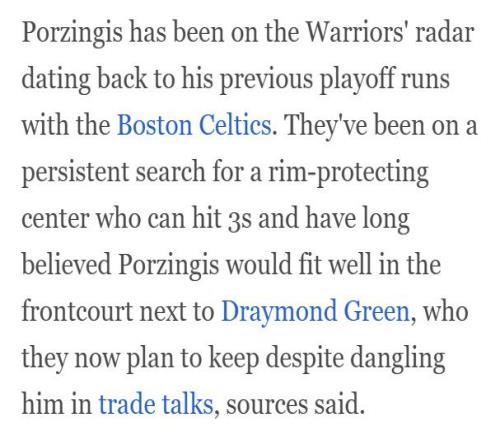 勇士隊記表示在波爾津吉斯為凱爾特人打季后賽時,勇士就盯上了他。勇士一直在尋找能護筐能遠投的中鋒,他們始終認為,波爾津吉斯非常適合與追夢格林搭檔內(nèi)線,盡管此前曾把追夢放進交易籌碼,但現(xiàn)在勇士計劃留下這位功勛球員。