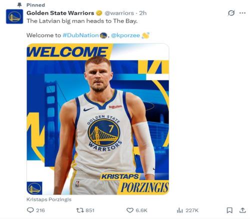 勇士官方宣布交易達(dá)成歡迎波爾津吉斯到來。
