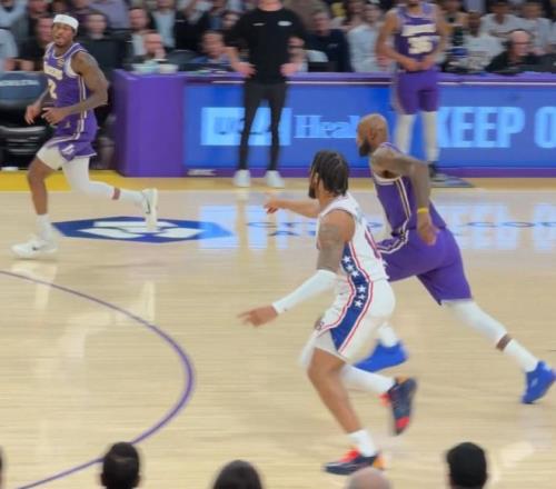 第三節開場詹姆斯各種的喂飯時刻,二連鐵后再送兩失誤,他幫助費城拉開到18分,但41歲的老年人終于覺醒了,身先士卒從防守做起還完成一個2+1,這一節詹姆斯3中1拿3分3助攻1蓋帽2失誤,三節9中2拿7分8助攻6失誤。