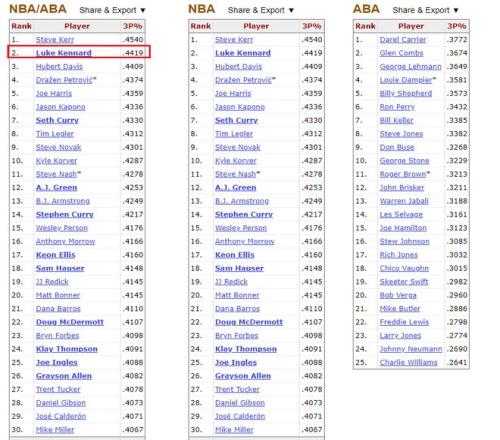 在NBA歷史三分命中率榜上,肯納德以44.2%高居第二,僅次于史蒂夫·科爾的45.4%。NBA現役球員中,塞斯·庫里以43.3%排名歷史三分命中率榜第七,A.J.格林42.5%排名第12。史蒂芬·庫里以42.2%排名歷史第14。