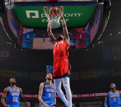 申京自投自搶送助攻,小賈巴里·史密斯三分一箭穿心,新援麥凱恩替補登場,迎來雷霆生涯首秀。謝潑德突破低手上籃高打板命中,火箭首節28-28戰平雷霆。
