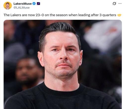 本場擊敗勇士隊后,開賽至今,當湖人隊領先進入第四節(jié)時拿到了23勝0負的全勝戰(zhàn)績。