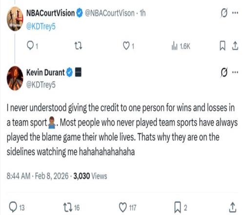 除此之外,杜蘭特還回擊了連續(xù)三個賽季該為球隊失敗擔責的言論,坦言籃球是一項團隊運動,不能將勝利和失敗的功勞或責任歸于一個人,很多人從未參與過團隊運動,只是癡迷于相互指責。