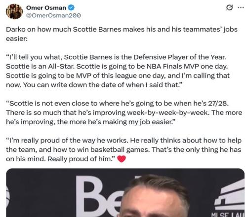 面對巴恩斯這樣的表現(xiàn),猛龍隊主帥拉賈科維奇猛夸到:“我跟你說,巴恩斯是年度最佳防守球員,他是全明星球員,總有一天他會成為FMVP,也會成為這個聯(lián)盟的MVP,你們可以記下我說這番話的日期?!?/p>