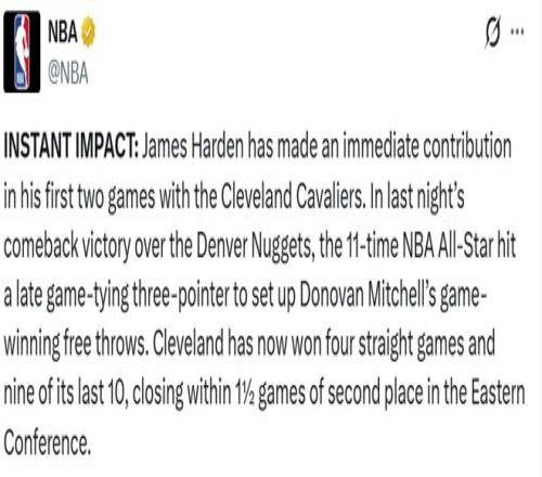 NBA官方也對哈登加盟騎士后的作用給予很高的評價。NBA官方賬號寫道:“即時效應: 詹姆斯-哈登在加盟克利夫蘭騎士的前兩場比賽就立刻做出了貢獻。在昨晚逆轉擊敗丹佛掘金的比賽中,這位11屆NBA全明星命中了一記關鍵的扳平三分,為米切爾的絕殺罰球奠定了基礎、騎士目前已經取得四連勝,近10場比賽贏下9場,與東部第二的差距僅剩1.5個勝場?!?/p>