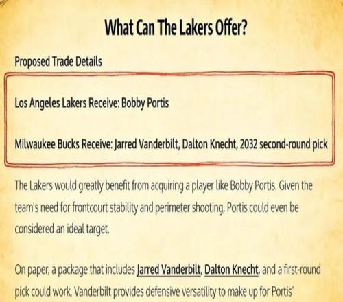 美媒《Fadeaway World》撰文建議,湖人應該打包送出范德比爾特、克內克特以及2032年的首輪簽,從雄鹿引入波蒂斯。
