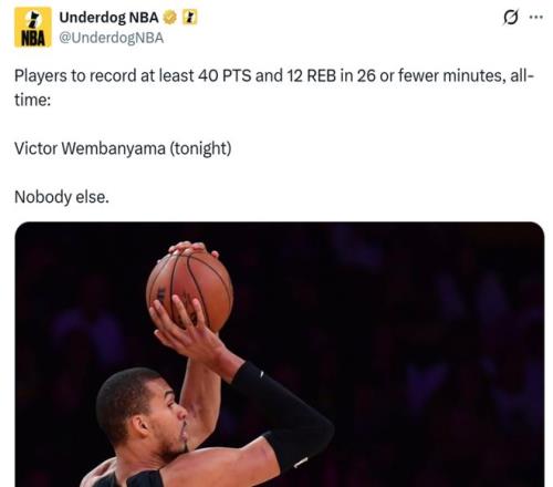 這也是文班生涯第二次在30分鐘內(nèi)砍下40+,追平哈登、恩比德、杰倫布朗并列歷史第三,僅次于克萊4次與庫(kù)里5次。