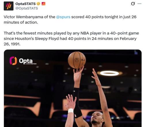 他還僅花費(fèi)26分零6秒,也讓文班亞馬成為NBA近35年單場(chǎng)拿到40+得分用時(shí)最短的球員。