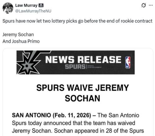 賽前馬刺官方宣布裁掉22年9號秀杰里米-索漢,這是馬刺連續第二年裁掉樂透秀,上個賽季馬刺曾裁掉21年12號秀普里莫,兩人都沒能執行完新秀合同。