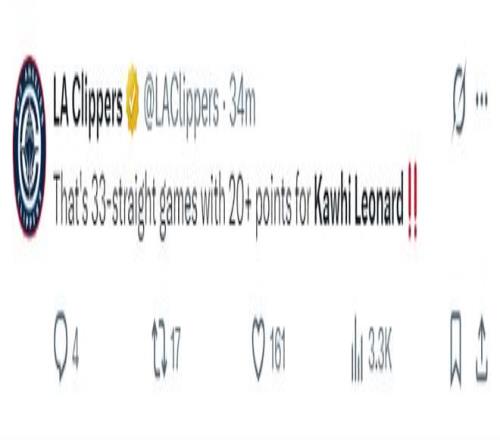 此役后小卡還連續33場比賽拿到20+快船隊史獨享歷史第三。