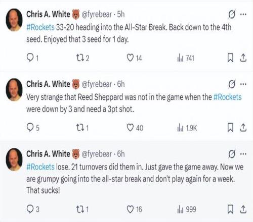 火箭隊在進入全明星周末前戰績33勝20負,而且在球隊需要一個三分球時烏度卡不讓謝潑德在場,火箭單場21次失誤也太糟糕了。杜蘭特也未能出手火箭的絕平一球。