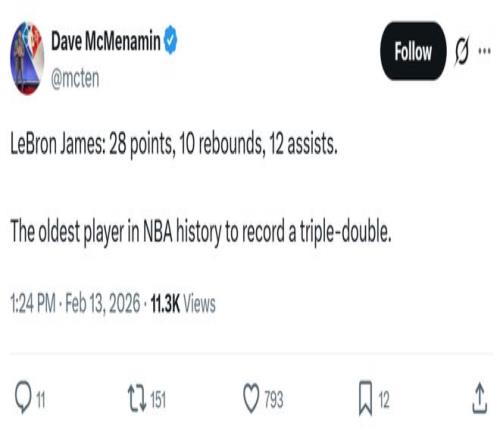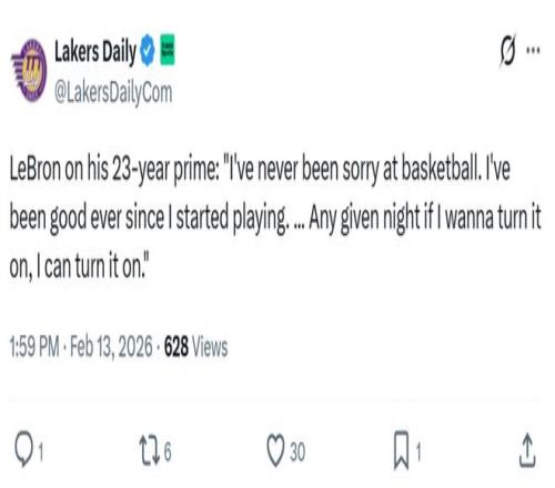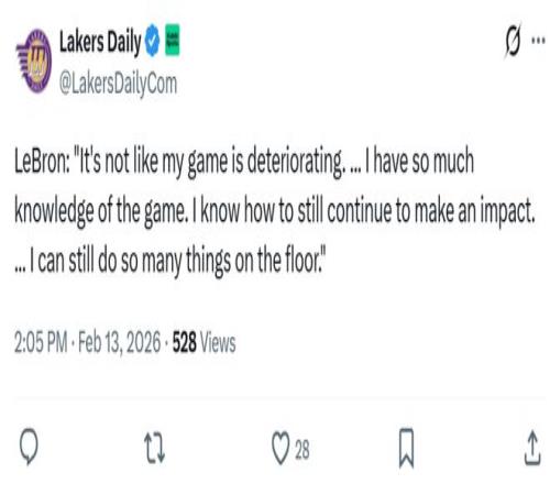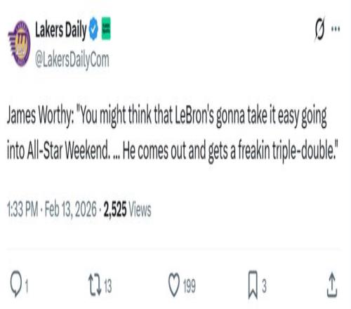 面對詹姆斯如此傲人的表現,湖人名宿沃西感嘆道:“當你認為詹姆斯可能會在全明星周末到來之際放松一下時,結果他一上場就拿了個三雙。”