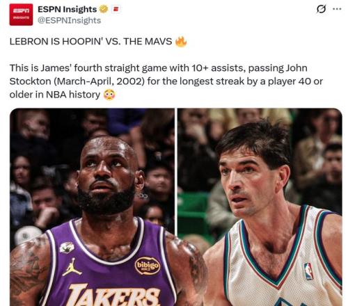 紀錄一:本場是詹姆斯連續第4場助攻數上雙,成功超越NBA助攻王斯托克頓,刷新NBA歷史上40歲及以上球員助攻連續上雙場次最長紀錄。