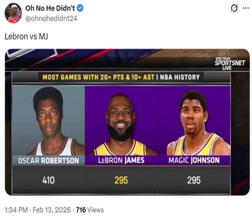 紀錄三:本場是詹姆斯生涯第295次單場至少交出20分10助,成功追平魔術師約翰遜并列NBA歷史第二,大O以410次高居歷史第一。