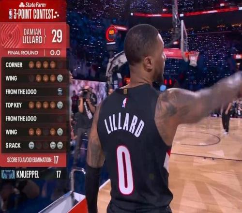 第八位登場的是開拓者球星利拉德,他本賽季因傷一場未打。利拉德第一個點命中3球,右側(cè)弧頂命中4球包括花球,隨后超遠(yuǎn)球不中。中路弧頂利拉德命中4球包括花球,左側(cè)超遠(yuǎn)球不中,左側(cè)弧頂5中5,最后一個花球點命中4球,利拉德最終得到27分。