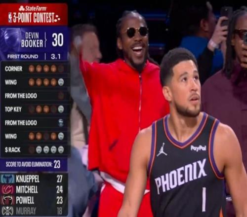 第七位登場的是衛(wèi)冕冠軍布克,他第一個點命中4球,左側(cè)弧頂5中5表現(xiàn)出色,但隨后超遠(yuǎn)球不中。布克中路命中3球,右側(cè)超遠(yuǎn)球也不中,右側(cè)弧頂命中4球,最后花球點再中4球,布克得到30分表現(xiàn)出色。