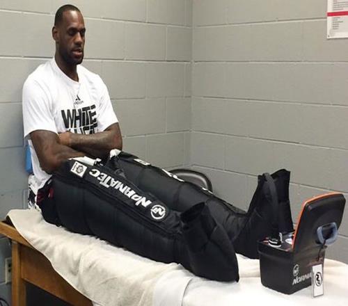 在湖人主場(chǎng)的一場(chǎng)比賽結(jié)束后,詹姆斯慢慢穿上冰浴足套,先把左腳、再把右腳浸入為他準(zhǔn)備好的冰桶。他合作多年的私人訓(xùn)練師兼運(yùn)動(dòng)表現(xiàn)教練邁克-曼西亞斯,隨后用冰袋裹住他的雙膝和背部。
