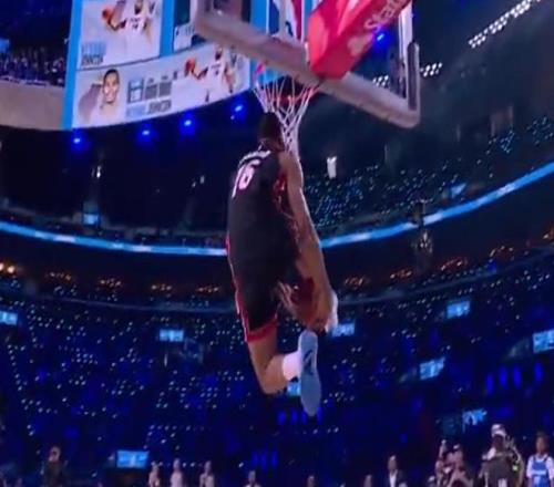 第二扣海斯率先登場,把球拋出,自己跟上接球,胯下換手扣入。兩次嘗試之后,第二次嘗試扣進,他得到47.2分,總分是91.8分。理查德森做的是傳球人把球打板,自己跟上接球扣籃。三次嘗試都沒有成功,第三次嘗試被籃板蓋了一下后重重摔在地板上。無奈之下,他只能選擇用一個轉體180度扣籃完成,得到43.4分,總分88.8分。