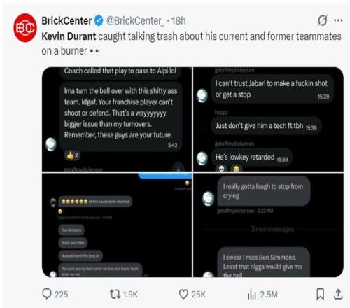 美媒BrickCenter也爆料了疑似杜蘭特小號的事件,因為這個賬號在社媒上各種炮轟杜蘭特的前隊友、現隊友。