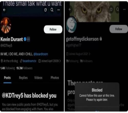 除此之外,杜蘭特的大號(hào)將這個(gè)小號(hào)拉黑了,而這個(gè)他不認(rèn)識(shí)的疑似小號(hào)也將他拉黑了,所以他確定這個(gè)賬號(hào)就是屬于杜蘭特。并且,該賬號(hào)的資料背景圖片,也曾在杜蘭特的大號(hào)里出現(xiàn)過(guò)(下圖的貓頭鷹):