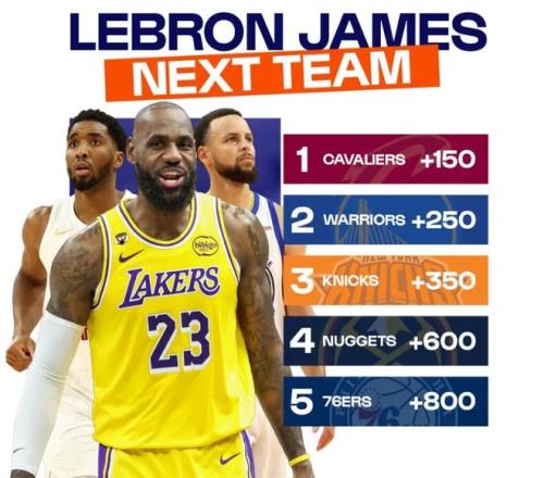 詹姆斯的最新下家賠率也顯示,騎士是頭號熱門下家,排在前五位的依次是騎士(+150)、勇士(+250)、尼克斯(+350)、掘金(+600)和76人(+800)。