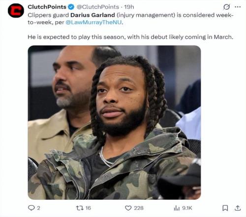 北京時間2月19日,根據(jù)快船記者勞里-穆雷的報道,達(dá)柳斯-加蘭目前還無法進(jìn)行對抗訓(xùn)練,他的腳趾還在康復(fù)中,他腳趾手術(shù)的傷口還沒有愈合,所以他的復(fù)出時間還需要視每日的觀察而定,預(yù)計加蘭最快也要三月份傷愈后首次登場。