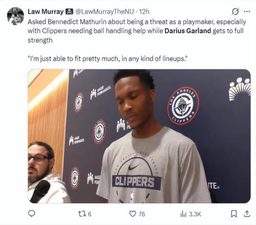 快船新援馬瑟林談到加蘭還無法登場,他表示:我基本上可以在任何陣容中找到自己的位置,球隊需要我做組織核心時我就會去做,尤其是在加蘭缺席快船需要加強(qiáng)控球能力的情況下。