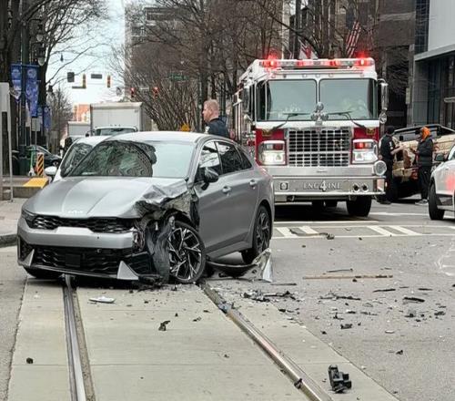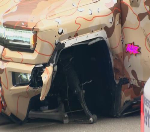 當地媒體報道,事故發生在Trade街Tryon街交叉口,一輛轎車受損停在路口中央。鮑爾那輛定制版的2022款GMC悍停在路邊,前輪已經不見了。 目擊者表示:一輛灰色起亞轎車沿Trade街向東行駛,鮑爾駕駛悍馬沿Trade街向西行駛,在試圖左轉駛入單向通行的Tryon 街時,兩車發生碰撞。