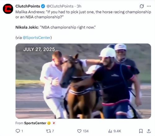 記者還詢問(wèn)約基奇,如果是你的賽馬冠軍與NBA冠軍你選擇哪一個(gè)?約基奇表示:如果是現(xiàn)在的話選NBA總冠軍。(此前約基奇在自己的馬奪冠后流淚,他談到詹姆斯退役后自己不僅不會(huì)哭,連傷感都不會(huì)有)