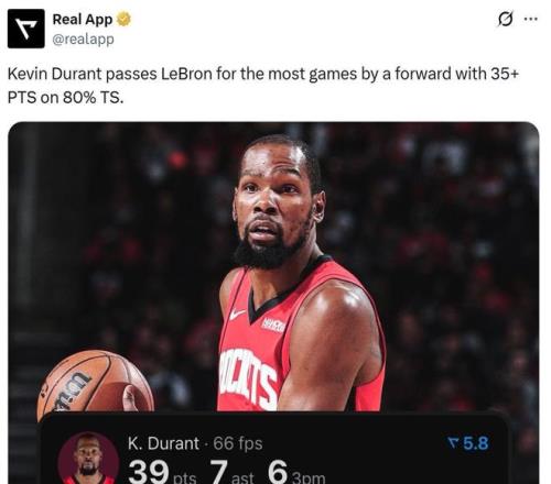 并且這是杜蘭特生涯第21次單場至少轟下35分且真實命中率80%+,成功超越詹姆斯(20次)獨占NBA鋒線歷史第一。