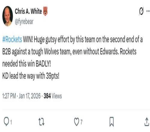 正如賽后火箭媒體人Chris A. White所說:“在背靠背第二戰,火箭隊擊敗了強敵森林狼,全隊展現出巨大的勇氣和拼勁,杜蘭特轟下39分,拿下了一場急需的勝利。”