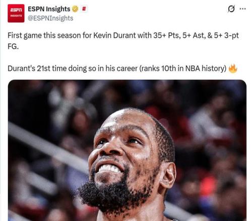 同時本場是杜蘭特加盟火箭之后,首次單場拿到至少35+5助攻+5三分,也是其生涯第21次,位列NBA歷史第十。