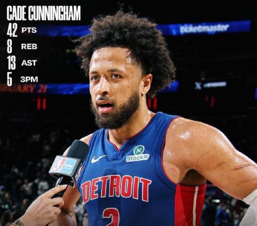 活塞和雷霆一樣,都是靠著年輕球員崛起成為聯盟強隊,目前坎寧安這個24歲小將已經成為活塞頭號球星,場均25.7分非常閃耀,他是球隊進攻端不可或缺的大殺器,本場比賽他狂砍42分,證明他的價值和潛力。
