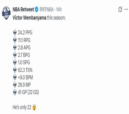 本賽季文班亞馬場均28.9分鐘,拿到24.2分11.1籃板2.8助攻1搶斷2.7蓋帽,命中率51.1%,三分命中率35.7%,真實命中率62.3%,BPM值+9。