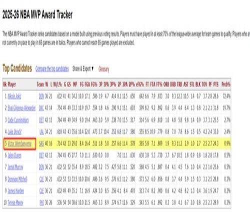 文班亞馬更強悍的地方在于,馬刺隊是西部第二的豪強,這讓文班亞馬的MVP概率排在聯盟第五,僅次于約基奇、亞歷山大、坎寧安、東契奇。從這個角度來看文班亞馬入選最佳一陣幾乎是板上釘釘,只要文班亞馬出戰超過65場應該就是最佳陣容。