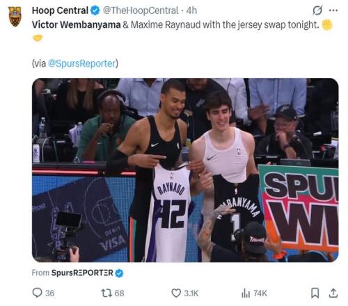 賽后文班亞馬與自己法國國青隊友雷諾互換了球衣。此役文班亞馬29分45秒,20中11,三分5中1,罰球7中5拿到28分15籃板6助攻1搶斷4蓋帽,命中率55%。雷諾則拿到16分12籃板1蓋帽。此役后文班亞馬生涯第545次蓋帽已經升至馬刺隊史第五。