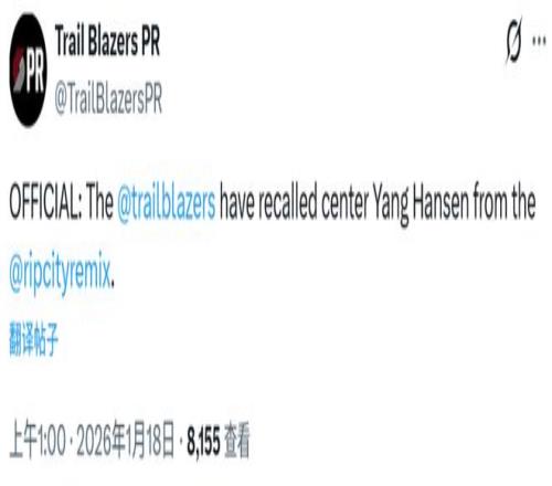 開拓者上一場比賽是1月16日對陣老鷹,最終117-101擊敗對手,但楊瀚森沒有獲得上場機會。他上一次在NBA出戰是1月14日對陣勇士,他打了12分33秒,投籃3中1,得到3分2籃板1助攻。賽季至今,楊瀚森在開拓者出戰23場比賽,場均2.5分1.8籃板0.8助攻,投籃命中率29.2%,三分命中率16.1%。