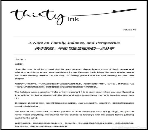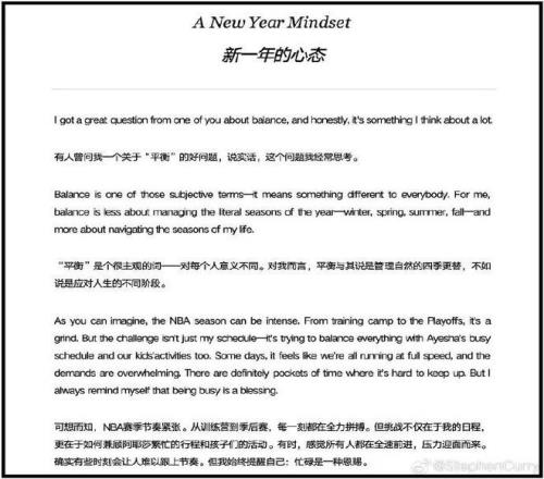 庫里還特意談到了平衡的話題。他說,平衡不是關于時間分配一樣多,而需要保持正確的視角(perspective)。 我沒怎么看懂什么是保持一種視角,他對于時間、平衡的理解應該跟我不太一樣。有沒有人分享下見解。