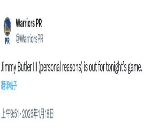 在這場(chǎng)比賽正式開打前,勇士官方曬出了本場(chǎng)首發(fā)陣容,巴特勒還在其中。但比賽開打后,理查德頂替巴特勒首發(fā),巴特勒也沒有出現(xiàn)在場(chǎng)邊。直到比賽打了快半節(jié),勇士官方才發(fā)布公告:巴特勒因個(gè)人原因?qū)⑷毕裉斓谋荣悺?/p>