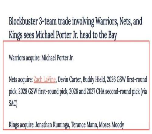 聯(lián)盟內(nèi)部對這筆交易的共識是,多方框架是實現(xiàn)共贏的唯一路徑。由于勇士對小波特的興趣明確,而籃網(wǎng)渴望積累更多重建資產(chǎn),庫明加成為了關(guān)鍵的“橋梁型籌碼”。這位23歲鋒線在1月15日交易限制解除后,其合同價值被重新激活——2026-27賽季2430萬美元的球隊選項,既具備薪資匹配的靈活性,又能為第三方球隊提供后續(xù)操作空間,被管理層視為“復(fù)雜交易中的優(yōu)質(zhì)資產(chǎn)”。最終浮出水面的潛在方案的核心的是:勇士引進小邁克爾·波特;籃網(wǎng)收獲扎克·拉文、德文·卡特、巴迪·希爾德,以及勇士2026年、2028年首輪簽和通過國王獲得的2026、2027年黃蜂次輪簽;國王則得到喬納森·庫明加、特倫斯·曼與摩西·穆迪。