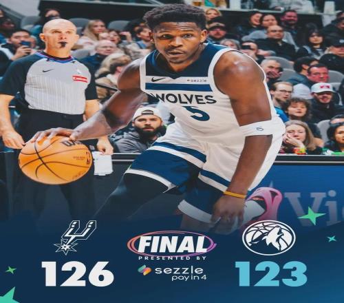 最后4秒,尚帕尼居然兩罰不中。文班搶到前場板,森林狼只能犯規,26分大逆轉失敗了。全場結束,馬刺主場126-123險勝森林狼。愛德華茲爆砍55分4板3助,得分打破生涯紀錄。文班亞馬39分9板3助2帽、??怂?5分3板12助!