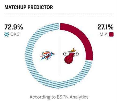 反觀雷霆目前以35勝7負的傲人戰績穩居聯盟榜首,展現出極強的競爭力。在短暫陷入低谷后,雷霆迅速以一波五連勝重振旗鼓,重拾贏球節奏與賽季初的王者之氣。近3場比賽,雷霆在面對馬刺、火箭等西部勁旅時毫不手軟,不僅悉數拿下勝利,更在比賽中重現賽季初的統治級表現,攻防兩端的壓制力拉滿。這波酣暢淋漓的連勝,不僅穩固了自身聯盟第一的位置,更向全聯盟彰顯了他們沖擊衛冕的堅定決心,狀態正佳的他們無疑是本賽季奪冠的絕對熱門。值得一提的是,本場熱火與雷霆的比賽,ESPN給出的勝率預測,雷霆高達72.9%,熱火只有27.1%的取勝機會。