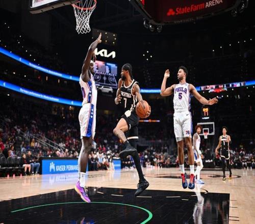老鷹過去5場收獲5連勝,76人上一場主場106-102險勝爵士,本賽季前三次交鋒老鷹均戰勝76人。本場76人缺少恩比德、喬治、埃奇庫姆,老鷹缺少庫明加。首節比賽前4分鐘,雙方持續緊咬比分纏斗至76人13-14落后,杰倫暴扣,76人一波9-0攻勢反超6分。76人多點開花逐步擴大33-22領先,并在之后擴大28-26領先優勢,老鷹再追3分,首節比賽結束76人38-29領先老鷹9分優勢。