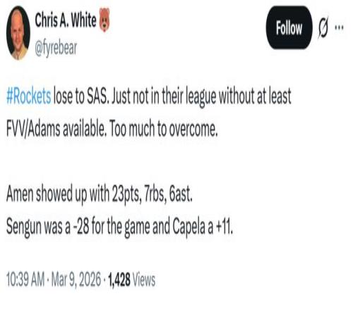 連火記Chris A. White都不禁感嘆,在缺少范喬丹與亞當斯的情況下,火箭隊根本就不是這支馬刺的對手,雙方實力差距巨大。