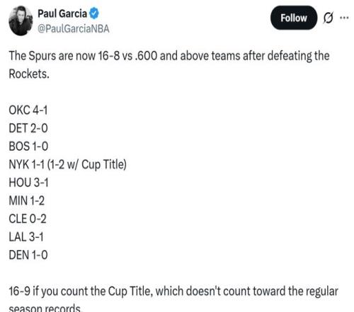 本場擊敗火箭隊之后,馬刺隊本賽季對陣勝率至少60%的前十強隊時豪取16勝8負傲人戰績(扣除杯賽決賽),對陣聯盟第一的雷霆4勝1負,對陣火箭與湖人兩隊均為3勝1負。