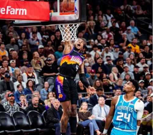 中場休息回來,雙方進攻火力均是有所下滑,黃蜂更是本場首次單節不足20分。太陽率先一波8-0攻勢擴大10分優勢,黃蜂連追5分,布克與吉萊斯皮接連得分,太陽重新擴大76-67領先優勢。黃蜂一波8-0攻勢追到差1分,太陽重新取得微弱優勢,太陽單節21-19凈勝2分,三節結束太陽81-77領先黃蜂。前三節比賽,黃蜂三分35中12,三球17+7+5與克努佩爾15分,引領4人得分上雙;太陽三分30中11,格林22分、布克23+7與吉萊斯皮15分。