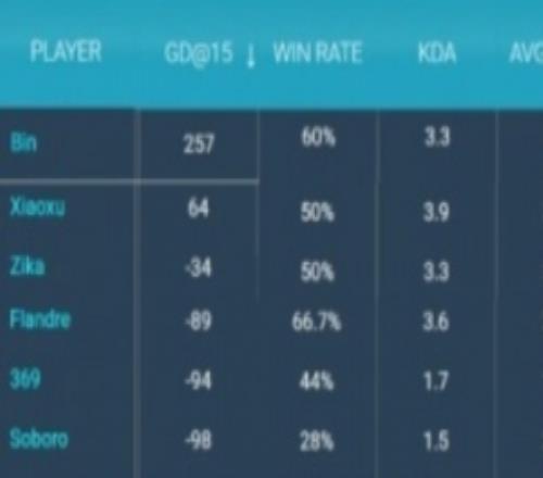 電競體育2月13報道 外網(wǎng)數(shù)據(jù)網(wǎng)站統(tǒng)計LPL第一賽段常規(guī)賽登峰組上單數(shù)據(jù):前15經(jīng)濟差Bin第一257。