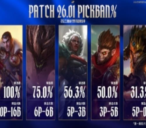 26.01版本第一賽段開賽至今打野英雄禁選率一覽,其中杰斯禁選率達到100%;