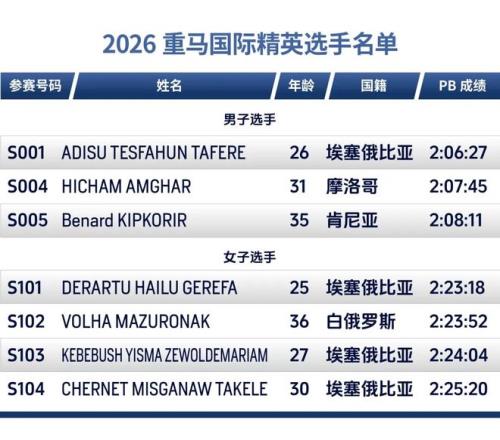 重獎之下,必有勇者。此次重馬的參賽陣容頗有來頭。國際男選手方面,26歲的阿迪蘇·特斯法洪·塔費雷最好成績是去年在塞維利亞馬拉松跑出的2:06:27,他也將成為本屆重馬破賽會紀錄最有力的人選之一;另外兩位國際男選手也都在207和208的水平,都有機會奪冠并破賽會紀錄。而四位國際女選手的最好成績都要好于重馬國內衛冕冠軍丁常琴。