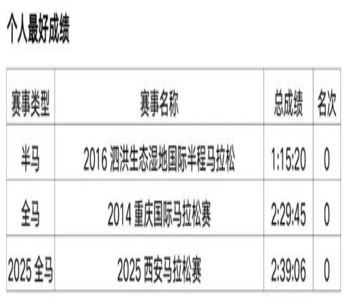 原從事辦公室文員工作,2018年開始接觸馬拉松和越野賽,在此之前無專業隊服役經歷,高中時期在校練過一年400米專項。2019年首半馬143,首全馬316,2021年半馬117,全馬238,全程馬拉松達標國家健將等級。